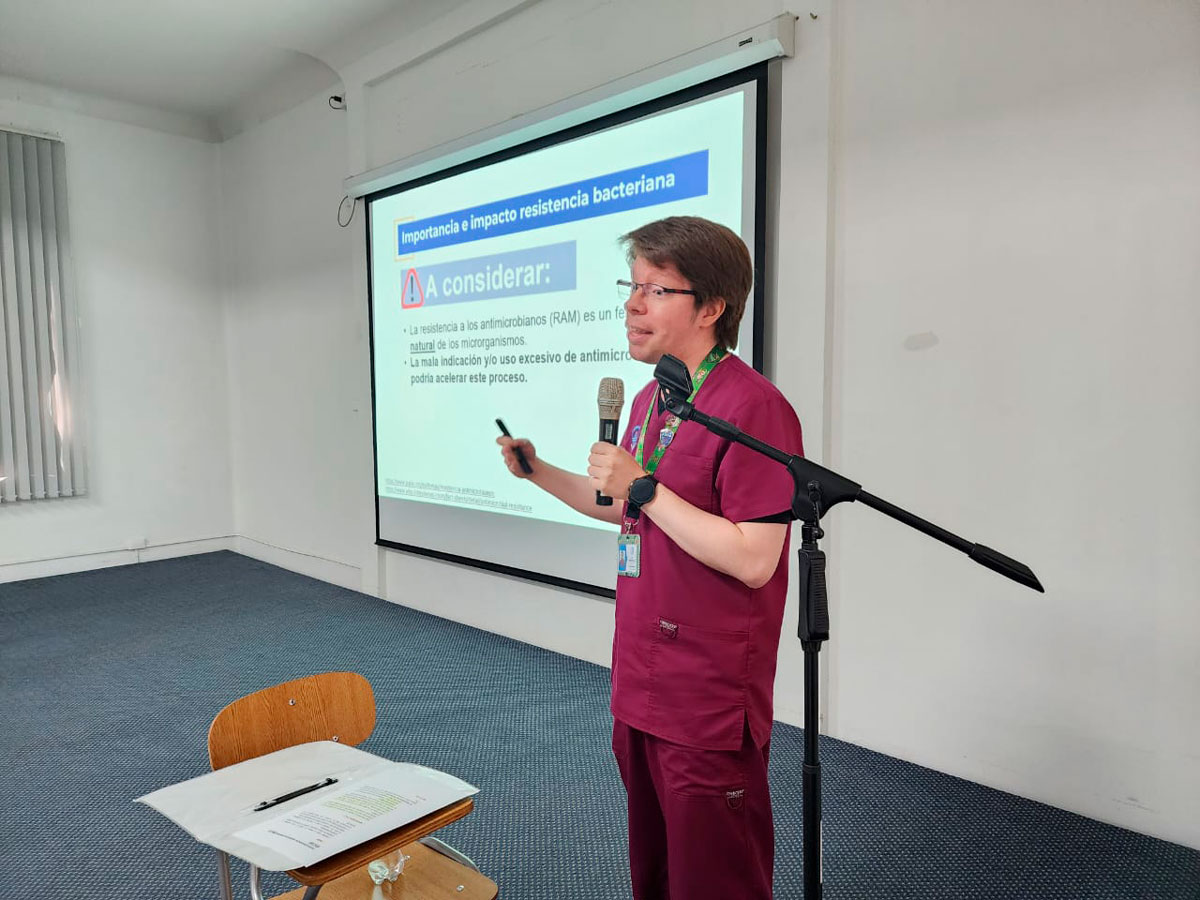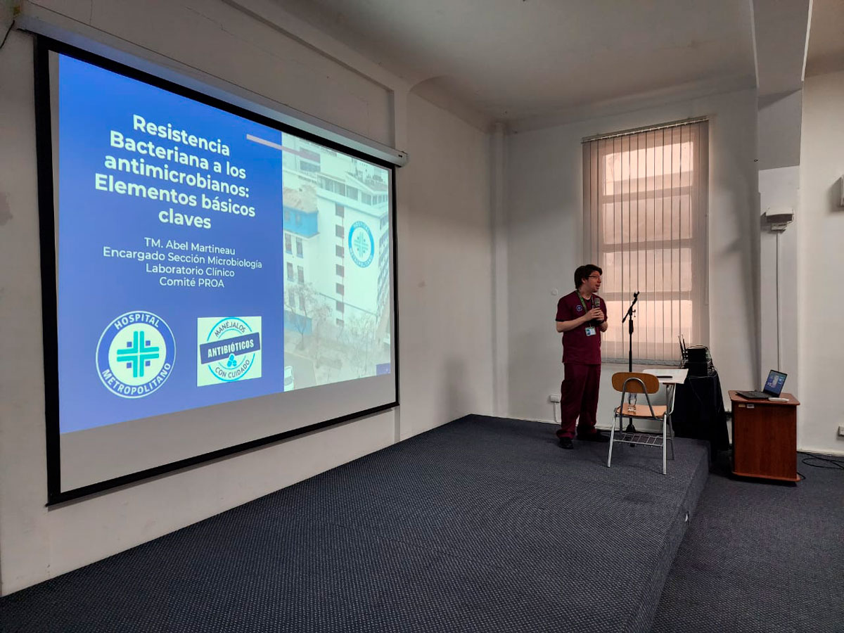 La exposición estuvo a cargo del tecnólogo médico Abel Martineau, encargado de la sección de Microbiología del Laboratorio Clínico e integrante del Comité PROA, quien presentó los elementos básicos clave para comprender este fenómeno, sus implicancias clínicas y la importancia de abordarlo desde una perspectiva multidisciplinaria.